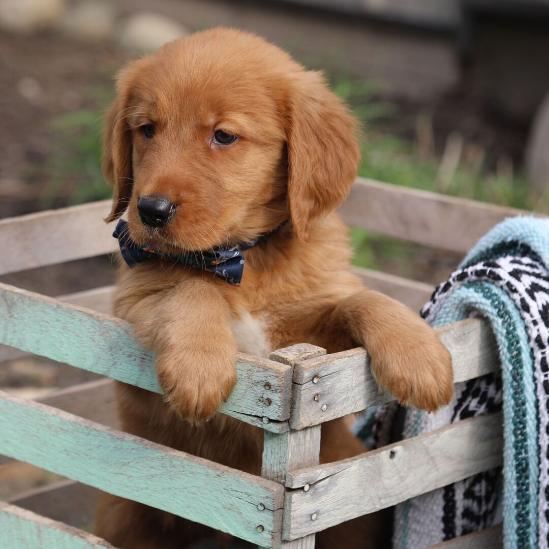 Hi, I'm Titan! I'm a 9-week-old male Golden Retriever with a beautiful dark golden coat, born on March 1, which makes me a Pisces pup. I am ready now to plan my trip to my forever family. Once I reach my adult size, I'm expected to weigh between 65–75 lbs. I'm AKC registered. I want you to want me, I need you to need me, and I'd love you to love me... forever together.
